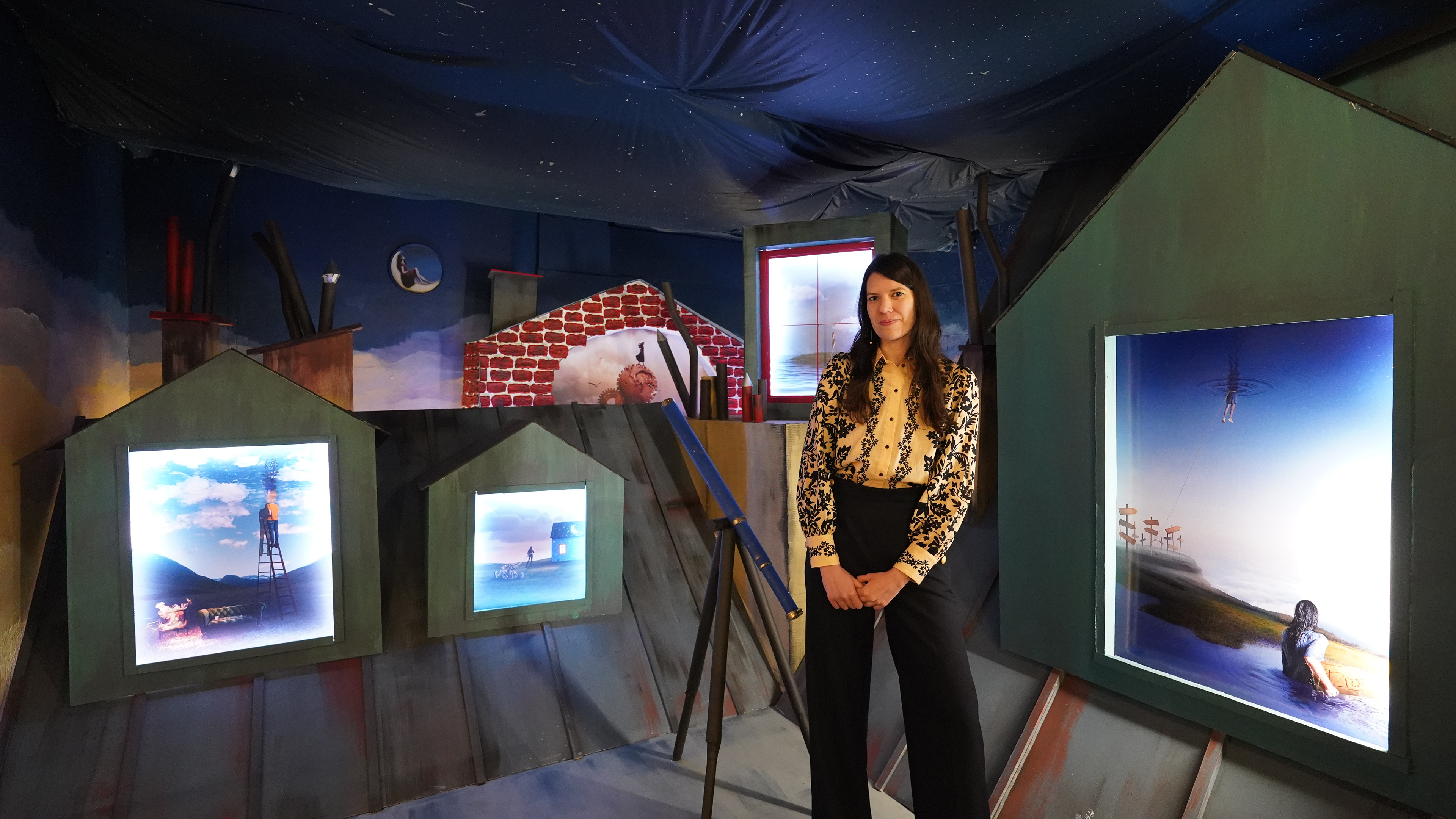 Cette installation vous plonge dans une vue de nuit peuplée de fenêtres illuminées, et où chaque fenêtre semble être le fragment d'un rêve devenu réalité, vous invitant à explorer les profondeurs de l'inconscient humain à travers mon langage photographique surréaliste, où les rêves prennent vie et où l'impossible devient possible.